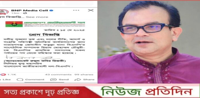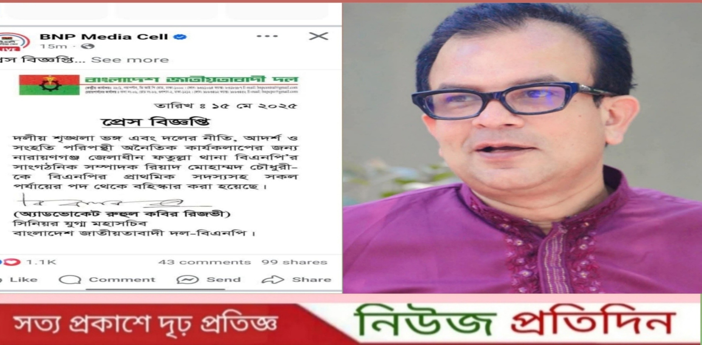 দলীয় শৃঙ্খলা ভঙ্গের অভিযোগে নারায়ণগঞ্জের ফতুল্লা থানা বিএনপির সাংগঠনিক সম্পাদক রিয়াদ মোহাম্মদ চৌধুরীকে দলের প্রাথমিক সদস্য পদসহ সকল পদ থেকে বহিষ্কার করেছে বিএনপি।