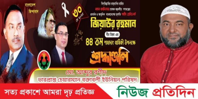 নিউজ প্রতিদিন ডটনেট : বাংলাদেশ জাতীয়তাবাদী দলের (বিএনপি) প্রতিষ্ঠাতা, মহান স্বাধীনতার ঘোষক, বীর মুক্তিযোদ্ধা, সাবেক রাষ্ট্রপতি শহীদ প্রেসিডেন্ট জিয়াউর রহমান বীর উত্তমের ৪৪তম শাহাদাত বার্ষিকী উপলক্ষে তাঁর স্মৃতির প্রতি গভীর শ্রদ্ধা ও ভালোবাসা নিবেদন করেছেন বক্তাবলী ইউনিয়ন পরিষদের ভারপ্রাপ্ত চেয়ারম্যান মো. আব্দুর রশীদ। এ উপলক্ষে গণমাধ্যমে পাঠানো এক শোকবার্তায় তিনি এই শ্রদ্ধা জানান।