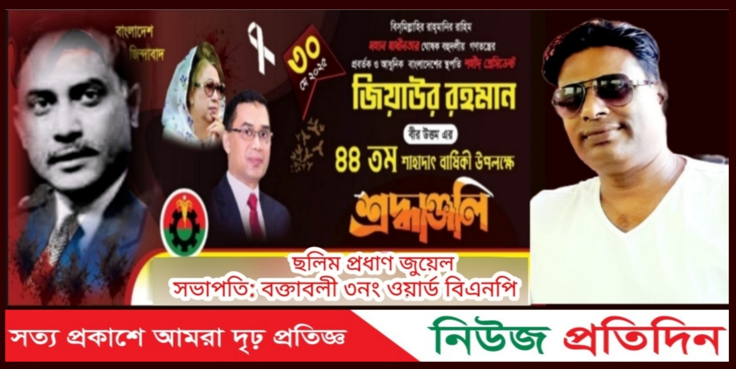নিউজ প্রতিদিন ডটনেট : বাংলাদেশ জাতীয়তাবাদী দলের (বিএনপি) প্রতিষ্ঠাতা, মহান স্বাধীনতার ঘোষক, বীর মুক্তিযোদ্ধা, সাবেক রাষ্ট্রপতি শহীদ প্রেসিডেন্ট জিয়াউর রহমান বীর উত্তমের ৪৪তম শাহাদাত বার্ষিকী উপলক্ষে তাঁর স্মৃতির প্রতি গভীর শ্রদ্ধা ও ভালোবাসা নিবেদন করেছেন বক্তাবলী ইউনিয়ন ৩নং ওয়ার্ড বিএনপির সভাপতি মো. ছলিম প্রধাণ জুয়েল।