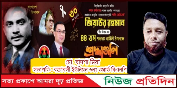 নিউজ প্রতিদিন ডটনেট : বাংলাদেশ জাতীয়তাবাদী দলের (বিএনপি) প্রতিষ্ঠাতা, মহান স্বাধীনতার ঘোষক, বীর মুক্তিযোদ্ধা, সাবেক রাষ্ট্রপতি শহীদ প্রেসিডেন্ট জিয়াউর রহমান বীর উত্তমের ৪৪তম শাহাদাত বার্ষিকী উপলক্ষে তাঁর স্মৃতির প্রতি গভীর শ্রদ্ধা ও ভালোবাসা নিবেদন করেছেন বক্তাবলী ইউনিয়ন ৬নং ওয়ার্ড বিএনপির সভাপতি মো. বাদশা মিয়া।