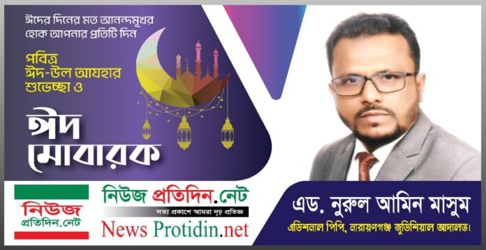 ৬জুন (শক্রবার) এক শুভেচ্ছা বার্তায় নারায়ণগঞ্জ জুডিশিয়াল ম্যাজিষ্টেট আদালতের এপিপি চীপ- এড. নূরুল আমিন মাসুম বলেন, ঈদের খুশি আপনাদের, আমাদের জীবনকে মহান আল্লাহতায়ালা পূর্ণতা দান করুন, এই দোয়া করি।
