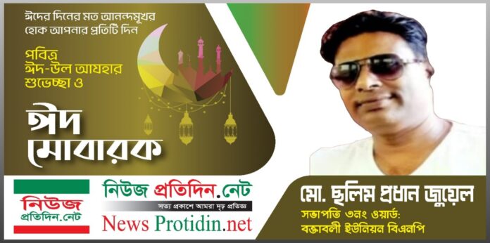 ৬জুন (শক্রবার) এক শুভেচ্ছা বার্তায় বক্তাবলী ইউনিয়ন ৩নং ওয়ার্ড বিএনপির সভাপতি মো. ছলিম প্রধাণ জুয়েল বলেন, ঈদের খুশি আপনাদের, আমাদের জীবনকে মহান আল্লাহতায়ালা পূর্ণতা দান করুন-এই দোয়া করি।