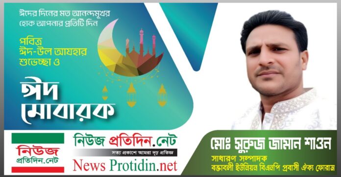 নিউজ প্রতিদিন ডটনেট : আসন্ন পবিত্র ঈদুল আজহা উপলক্ষে বক্তাবলী ইউনিয়ন ৩নং ওয়ার্ডের সর্বস্থরের জনগনসহ এবং দেশ-বিদেশে অবস্থানরত সকলকে পবিত্র ঈদুল আজহার শুভেচ্ছা জানিয়েছেন বক্তাবলী ইউনিয়ন পরিষদের ৩নং ওয়ার্ডের মেম্বার-পদপ্রার্থী ও বক্তাবলী ইউনিয়ন বিএনপি প্রবাসী ঐক্য ফোরাম সাধারণ সম্পাদক মো. সুরুজ জামান শাওন।