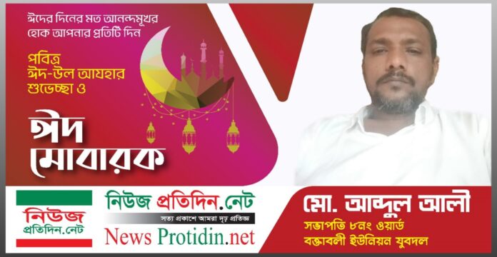 ৬জুন (শক্রবার) এক শুভেচ্ছা বার্তায় বক্তাবলী ইউনিয়ন ৮নং ওয়ার্ড যুবদলের সভাপতি আব্দুল আলী বলেন, ঈদের খুশি আপনাদের, আমাদের জীবনকে মহান আল্লাহতায়ালা পূর্ণতা দান করুন-এই দোয়া করি।