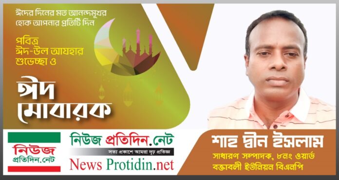 ৬জুন (শক্রবার) এক শুভেচ্ছা বার্তায় বক্তাবলী ইউনিয়ন ৮নং ওয়ার্ড বিএনপির সাধারণ সম্পাদক শাহ দ্বীন ইসলাম বলেন, ঈদের খুশি আপনাদের, আমাদের জীবনকে মহান আল্লাহতায়ালা পূর্ণতা দান করুন-এই দোয়া করি।