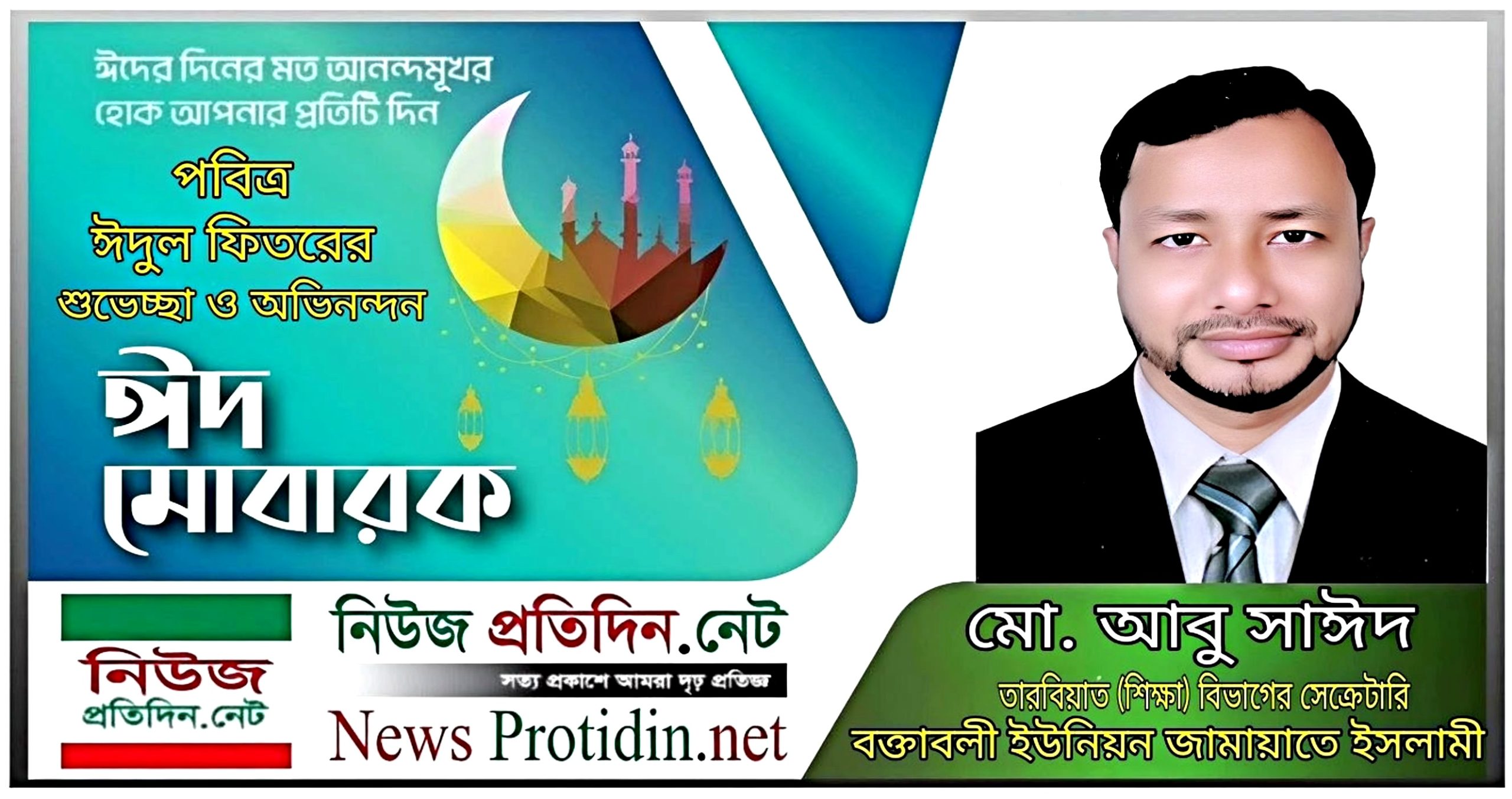নিউজ প্রতিদিন ডটনেট : পবিত্র ঈদুল ফিতর উপলক্ষে বক্তাবলীবাসীসহ সমগ্র দেশবাসীকে পবিত্র ঈদুল ফিতরের শুভেচ্ছা ও মোবারকবাদ জানিয়েছেন বক্তাবলী ইউনিয়ন জামায়াতে ইসলামীর তারবিয়াত (শিক্ষা) বিভাগের সেক্রেটারি মো. আবু সাঈদ।