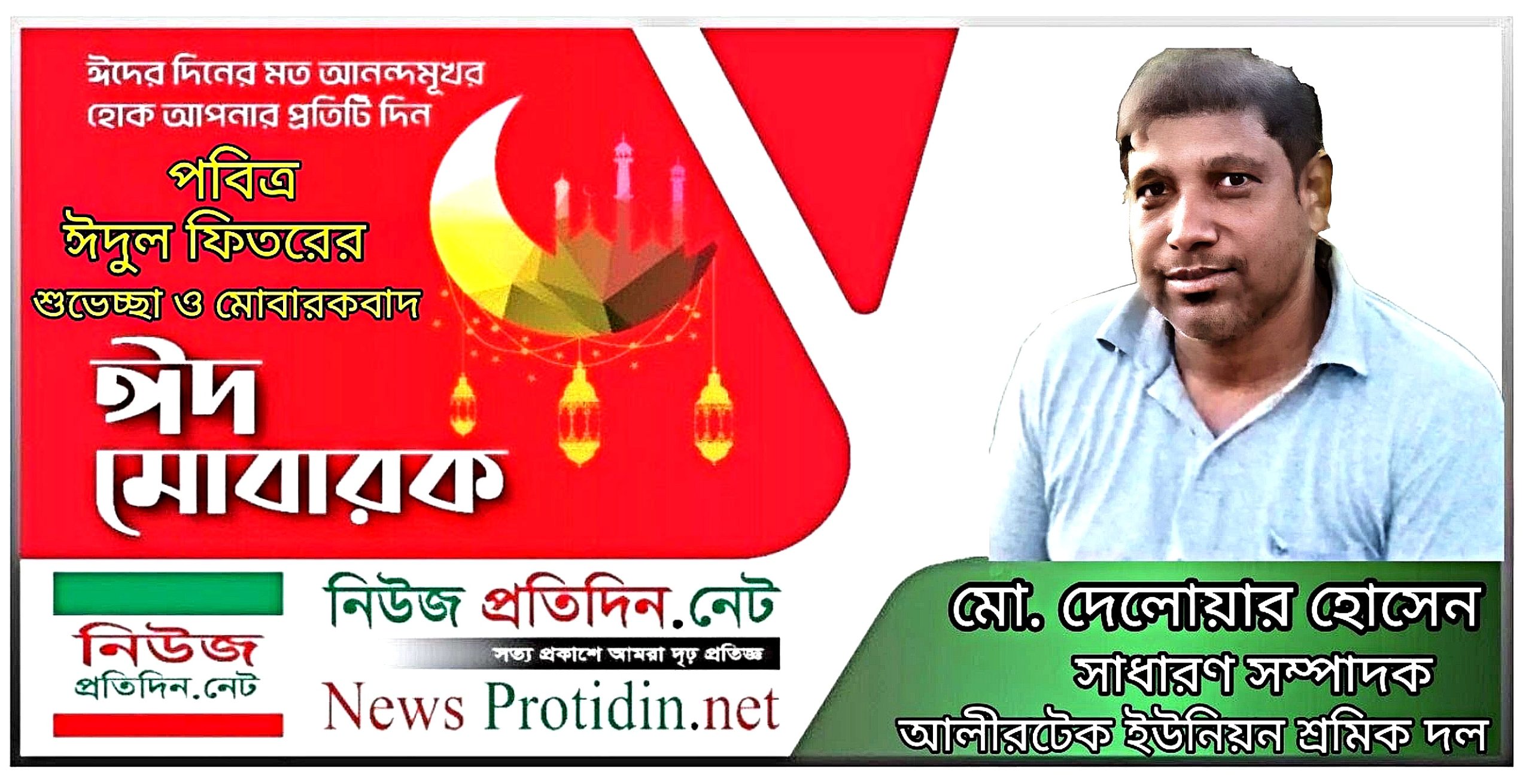 নিউজ প্রতিদিন ডটনেট : পবিত্র ঈদুল ফিতর উপলক্ষে আলীরটেকবাসীসহ সমগ্র দেশবাসীকে পবিত্র ঈদুল ফিতরের শুভেচ্ছা ও মোবারকবাদ জানিয়েছেন আলীরটেক ইউনিয়ন শ্রমিক দলের সাধারণ সম্পাদক মো. দেলোয়ার।